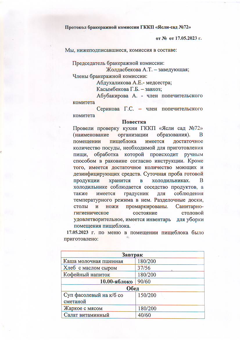 Бракераждық комиссия хаттамасы » КГКП "Ясли-сад №72"